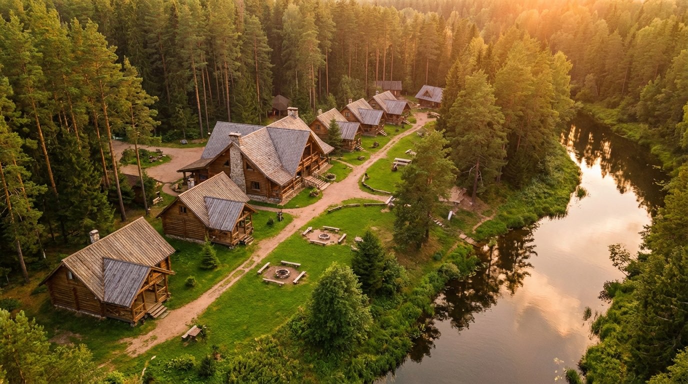Территория, коттеджи, природа и активности комплекса «Тихий лес»